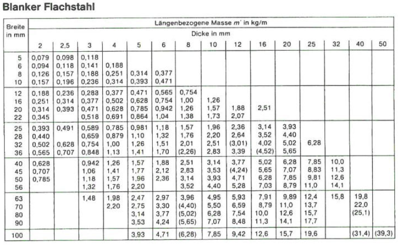 Ein Flachstahl 50 x 10 wird als Halbzeugt mit einer Länge von 3 m geliefert. Wie groß ist die Masse m (in kg) des Halbzeugs?