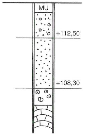 Die Skizze zeigt das Bohrprofil einer Straßentrasse. Welche Bodenart ist bei der Höhe +110,20 m nach DIN 4023 eingezeichnet?