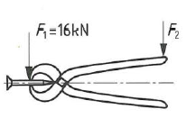 Mit einer Zange soll ein Nagel abgetrennt werden. Dazu ist an der Schneide eine Kraft F1 von 16 kN erforderlich. Welche Kraft F2 am Griff ist erforderlich, wenn der Abstand Drehpunkt -Schneide 3 cm beträgt und der Abstand Drehpunkt-Griffende 30 cm?