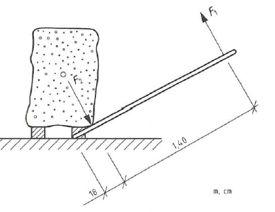 Berechnen Sie die Handkraft F1 (in N), mit der der Natursteinblock angehoben werden kann, wenn F2 51 kN beträgt.